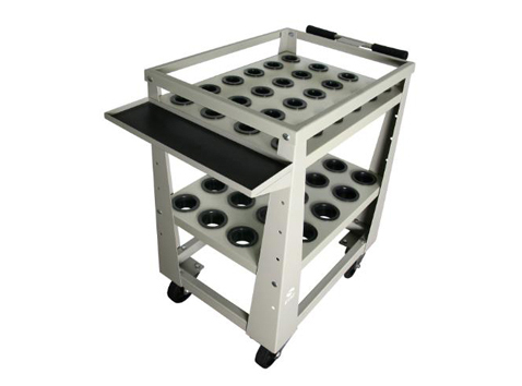 Carrinho com bandejas em chapas metálicas e buchas de polipropileno de acordo com o nº e o tipo de haste do ferramental do cliente.