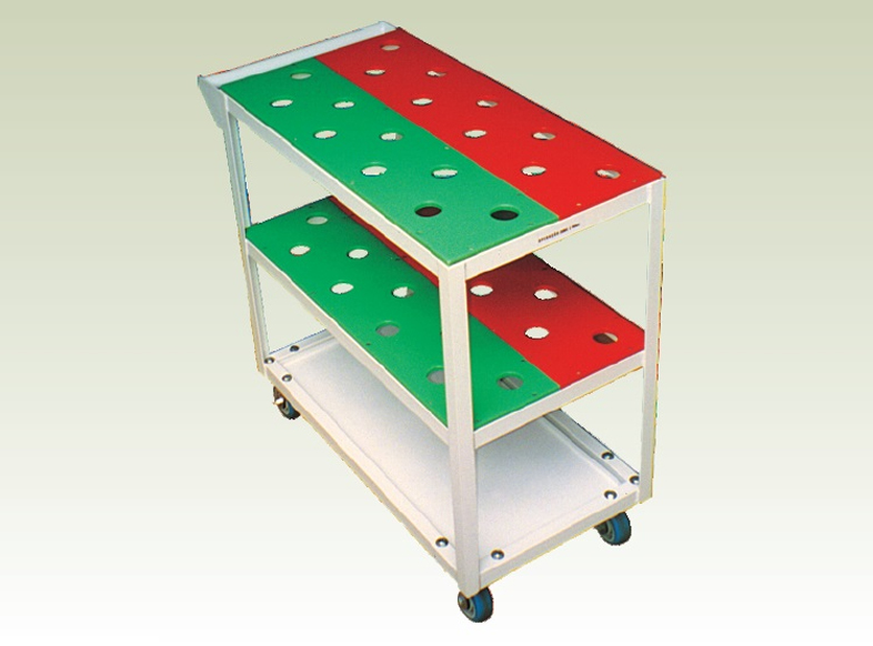 Carrinho Kanban verde/vermelho, montado com bandejas de polipropileno furadas de acordo com o nº de ferramentas e o tipo de haste do ferramental do cliente, estas bandejas são identificadas na cor verde para ferramentas já preparadas e vermelhas identificando que as ferramentas estão desgastadas e necessitando voltar para sala de preparação de ferramentas para serem reafiadas, reparadas e pré-ajustadas novamente.